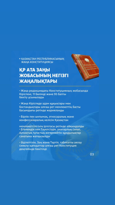 Қазақстан Республикасының жаңа Конституциясы жобасы елдің конституциялық дамуына сапалы мазмұндық өзгерістер енгізуді көздейді. Жаңа редакцияда Конституцияның құрылымы жүйеленіп, Кіріспе, 11 ...ҚАЗАҚСТАН РЕСПУБЛИКАСЫНЫҢ ЖАҢА КОНСТИТУЦИЯСЫ: АТА ЗАҢ ЖОБАСЫНЫҢ НЕГІЗГІ ЖАҢАЛЫҚТАРЫ