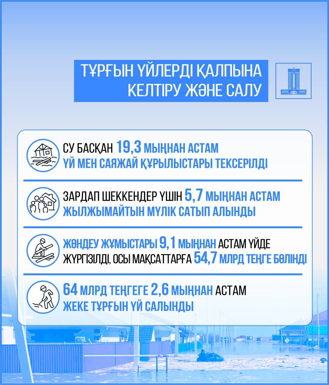 ✔️ Су тасқыны кезеңінде 120 мыңнан астам азамат құтқарылып, уақытша орналастыру пункттеріне орналастырылды, оларға барлық қажетті көмек көрсетілді.